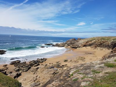 The beach stretches along the Breton coastline with fine sand, bordered by natural rock formations and clear waters reaching depths suitable for swimming.