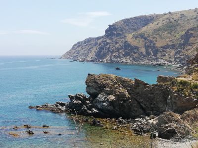 The clear waters of this beach reveal Mediterranean fish swimming between underwater rocks that form natural habitats.
