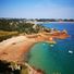 The beach features golden sand flanked by steep granite cliffs, with clear blue waters perfect for swimming during summer months.