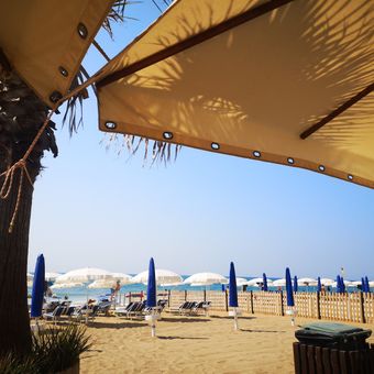 The beach provides sun loungers, umbrellas, and facilities, operating from Tuesday through Sunday between 8:30 AM and 8:00 PM throughout the season.