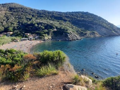 The northern coast beach of Elba Island combines fine pebbles with white sand stretches along clear blue waters against green hills.