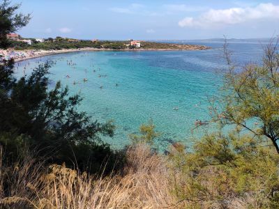 This sheltered beach stretches along 700 meters of coastline with light sand and clear Mediterranean waters near the southwestern tip of Sant'Antioco island.