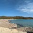 The 200-meter stretch of white sand meets clear blue water, bordered by tall granite and clay cliffs on the southern coast of Sardinia.