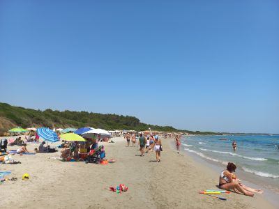 Two hundred meters of fine white sand meet clear blue waters between limestone cliffs and Mediterranean vegetation along the Salento coastline.