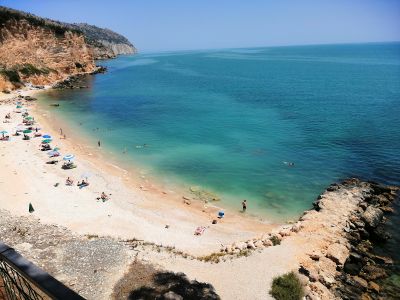 The beach features a double inlet formation with emerging rocks that create natural pools, offering opportunities for marine life observation.