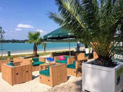 The Dagstrand beach features a natural pool surrounded by grassy areas and sand shores along the waters of central Limburg region.