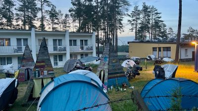 The OW Kormoran beach extends along clear waters with designated swimming areas and recreational facilities for water activities throughout the summer season.