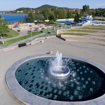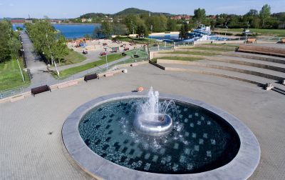 The beach incorporates natural landscaping elements from the Sudety Mountains region, creating distinct zones for different water-based activities.