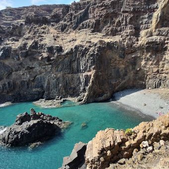 Praia do Zimbralinho is a shingle beach situated in a secluded cove, bordered by dramatic cliffs on both sides and fed by turquoise waters. The beach features a natural basin shape created by rocky outcrops that help keep the water clear and protected from stronger currents.