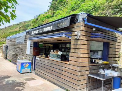 Alabortza hondartza stretches 12 meters in length and 8 meters in width, featuring a natural surface of cobble fragments and rocks along the coastline.