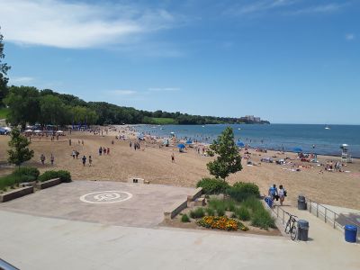 Edgewater Beach extends along 2,400 feet of Lake Erie shoreline, offering swimming access across 1,000 feet of sandy waterfront near downtown Cleveland.