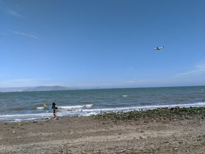 Located on the San Francisco Bay, Coyote Point Beach features a sandy shoreline with views of boats sailing across the water and planes landing nearby.