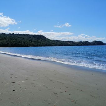 This 1.5-kilometer beach features soft gray sand bordered by mangroves and clear blue waters along the Pacific coast of Guanacaste Province.