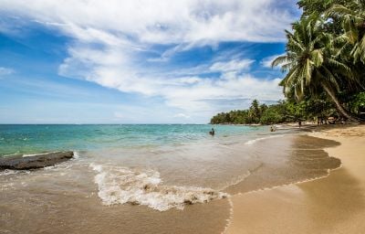 Punta Uva Beach is a quiet stretch of sand on Costa Rica's southern Caribbean coast with golden sand and clear water, surrounded by dense rainforest. The beach fronts a rocky point and is sheltered by an offshore coral reef that creates calm conditions for swimming and snorkeling.