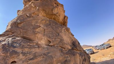 The entrance leads to rock art sites containing petroglyphs and inscriptions that record details of ancient human settlements and activities in the Arabian Peninsula.