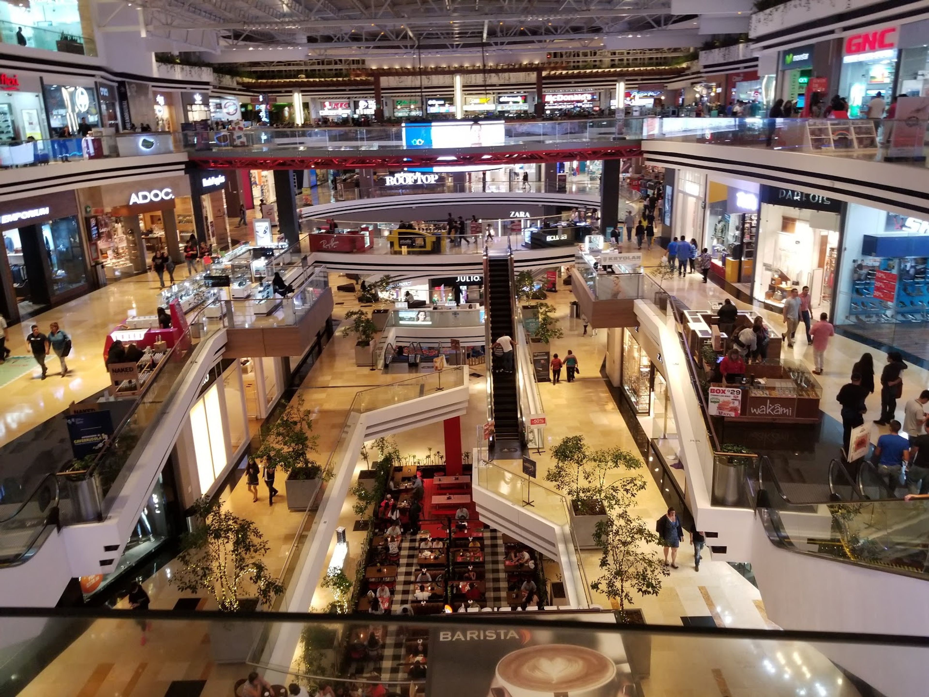 The mall's architecture incorporates natural light through large glass panels, while indoor gardens create spaces between retail sections.