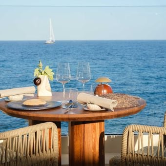 The Blue Bay restaurant presents dishes that merge Caribbean ingredients with Mediterranean products, served in a glass-walled dining room facing the sea.
