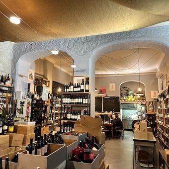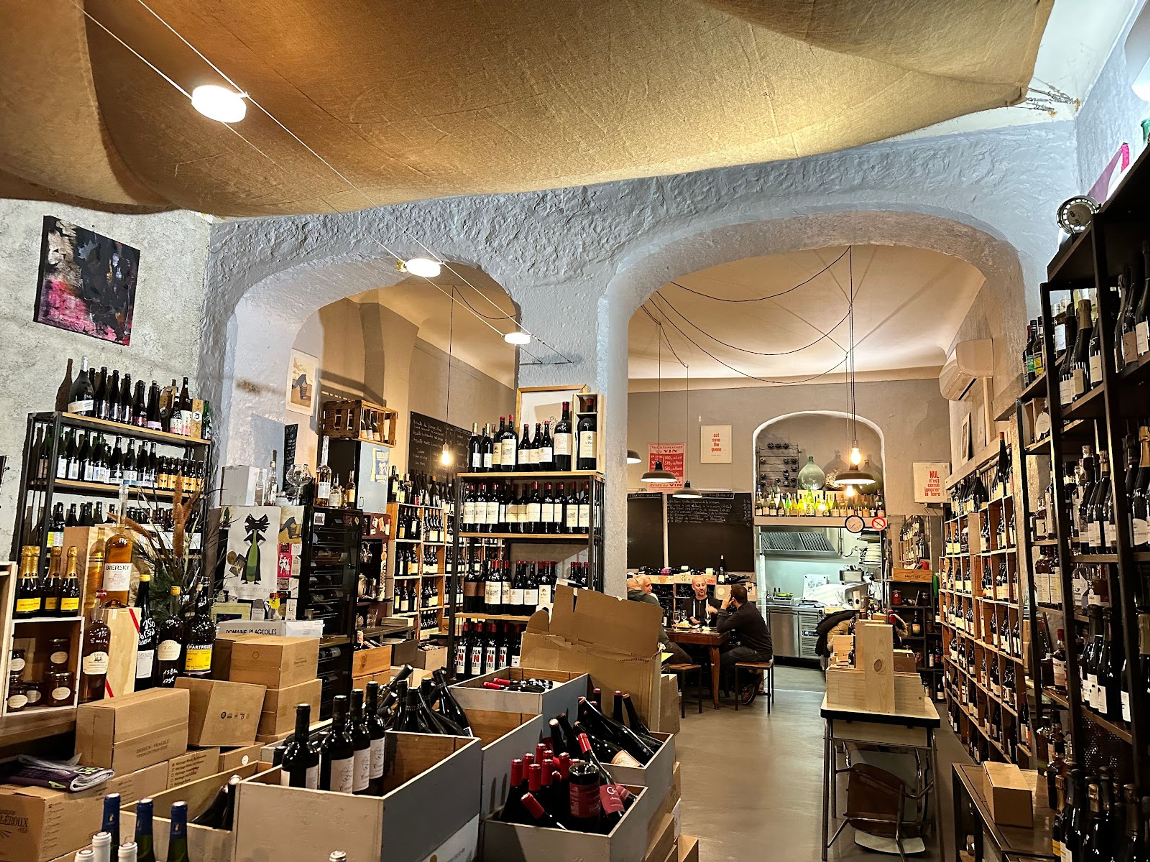 The wine cellar features a collection of natural wines from local and international producers, complemented by a regularly updated menu.
