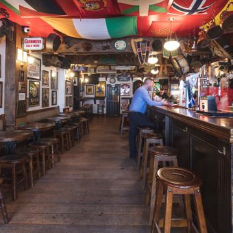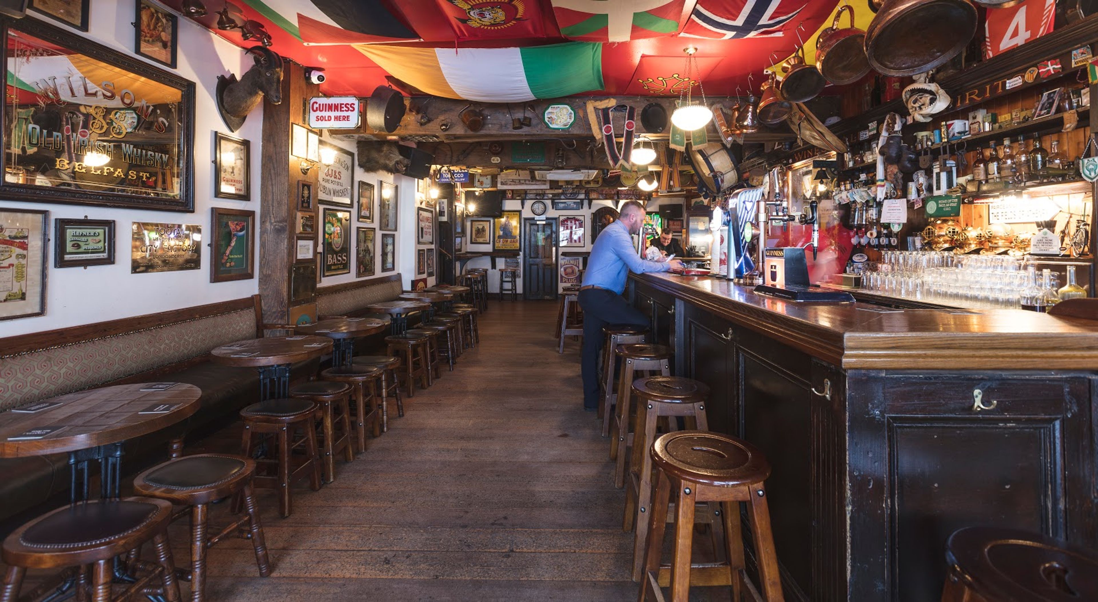 The interior displays numerous flags and features design elements reminiscent of traditional grocer pubs from Northern Ireland's past.