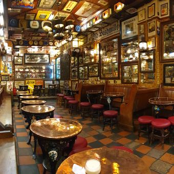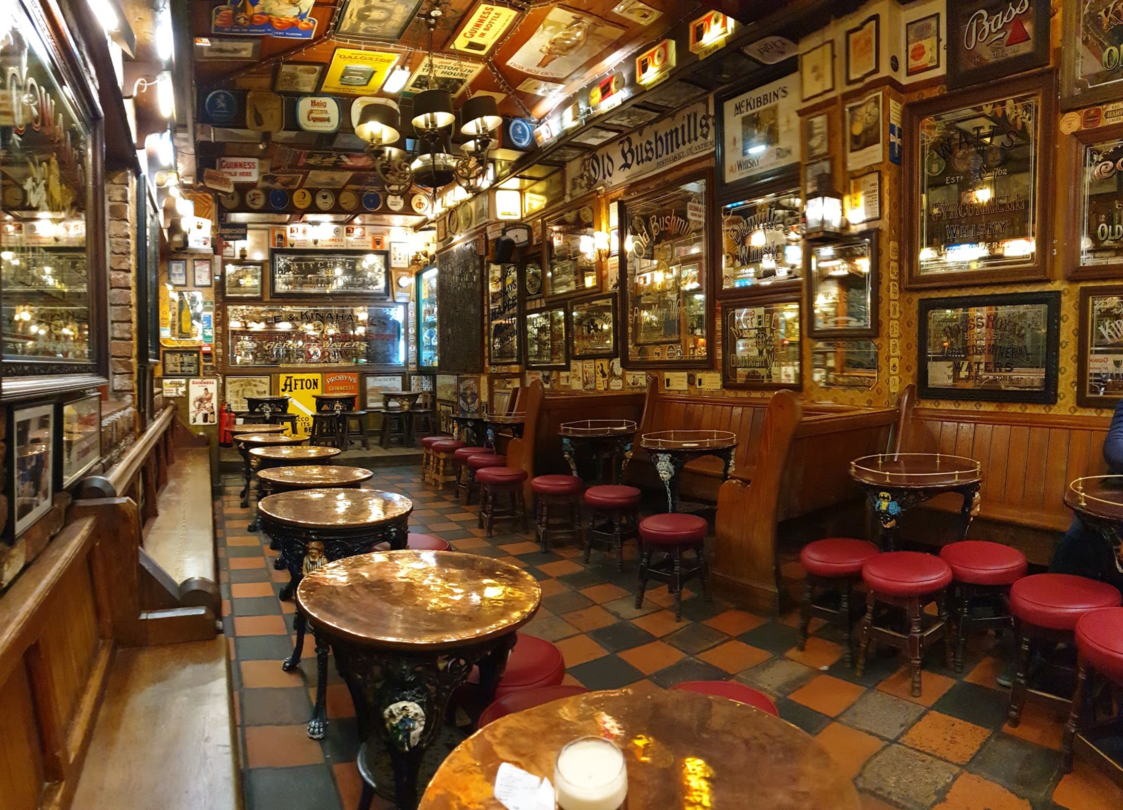 The walls feature an extensive collection of vintage whiskey advertisements and memorabilia from Belfast's industrial period, including items from former hotels.