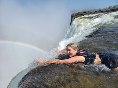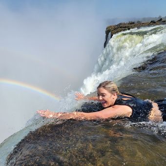 The Devil's Pool forms at the island's edge between September and December, creating a natural infinity pool above the waterfall.