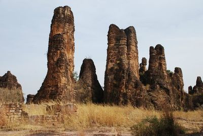 The Pics de Sindou features a collection of tall sandstone pillars that rise from the ground, creating distinctive shapes against the horizon.