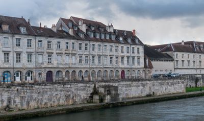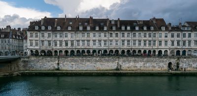 The Quai Vauban extends along the Doubs River with limestone buildings and iron railings creating a continuous architectural ensemble between the water and street level.