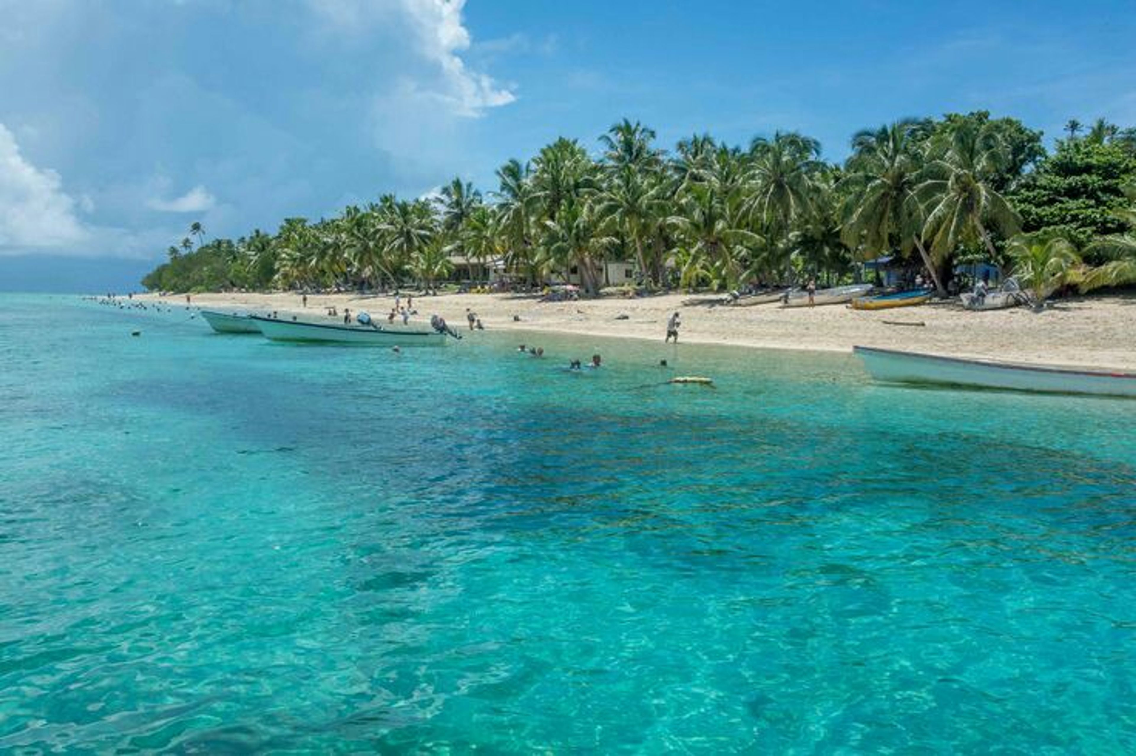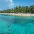 The island extends over 1.5 square kilometers, featuring white sand beaches bordered by palm trees and clear waters of the South Pacific Ocean.