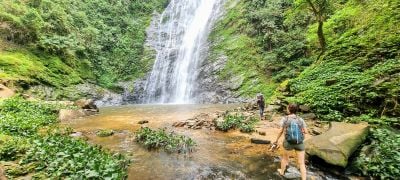 A professional guide leads visitors on a one-hour forest walk through coffee plantations from Tomegbé village to reach the waterfall entrance.