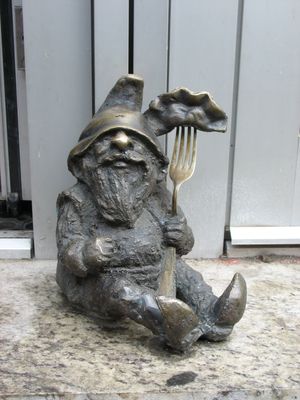 The bronze figure Pierożnik depicts a small gnome holding a fork with a dumpling, standing at the entrance of a local restaurant.