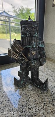 The bronze figure Centrostaluś stands 30 centimeters tall and represents a small gnome with specific details etched into its metallic surface.