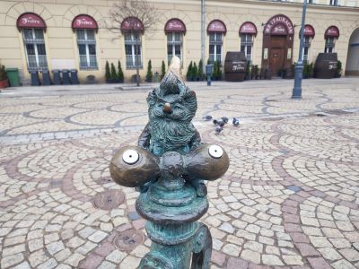 This bronze sculpture belongs to a collection of over 400 dwarf statues spread across Wrocław, each representing different aspects of local life and traditions.
