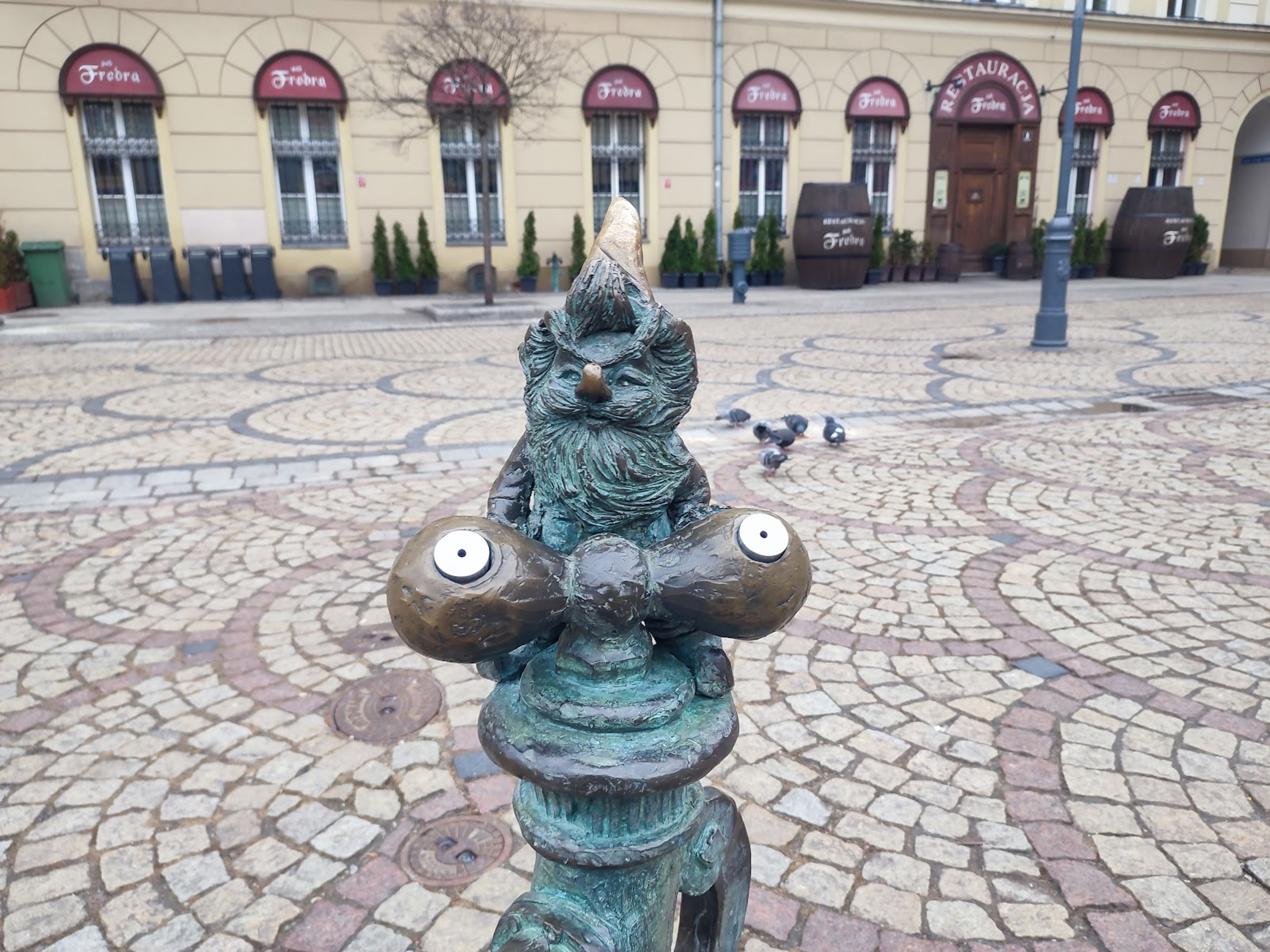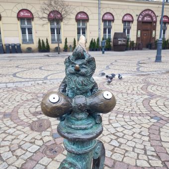 The Krasnal Orzeźwiacz statue, installed on June 30, 2015, encourages people to discover the medieval streets while searching for other bronze figures.