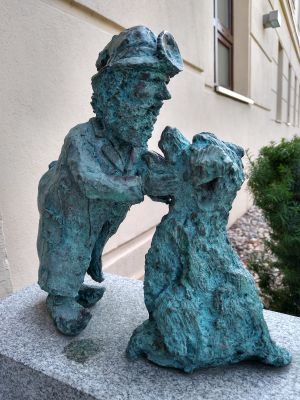 The bronze figure Roszek presents a small dwarf in a resting position on the ground level, measuring approximately 25 centimeters in height.