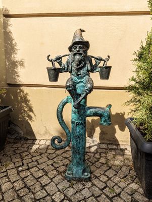 The Wodziarz dwarf statue stands at knee height and depicts a small figure designed as a water carrier in bronze material.