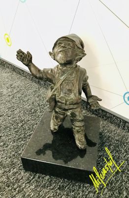 Epamek stands as a small bronze figure displaying intricate details and craftsmanship near the Hansel & Gretel houses in the city center.