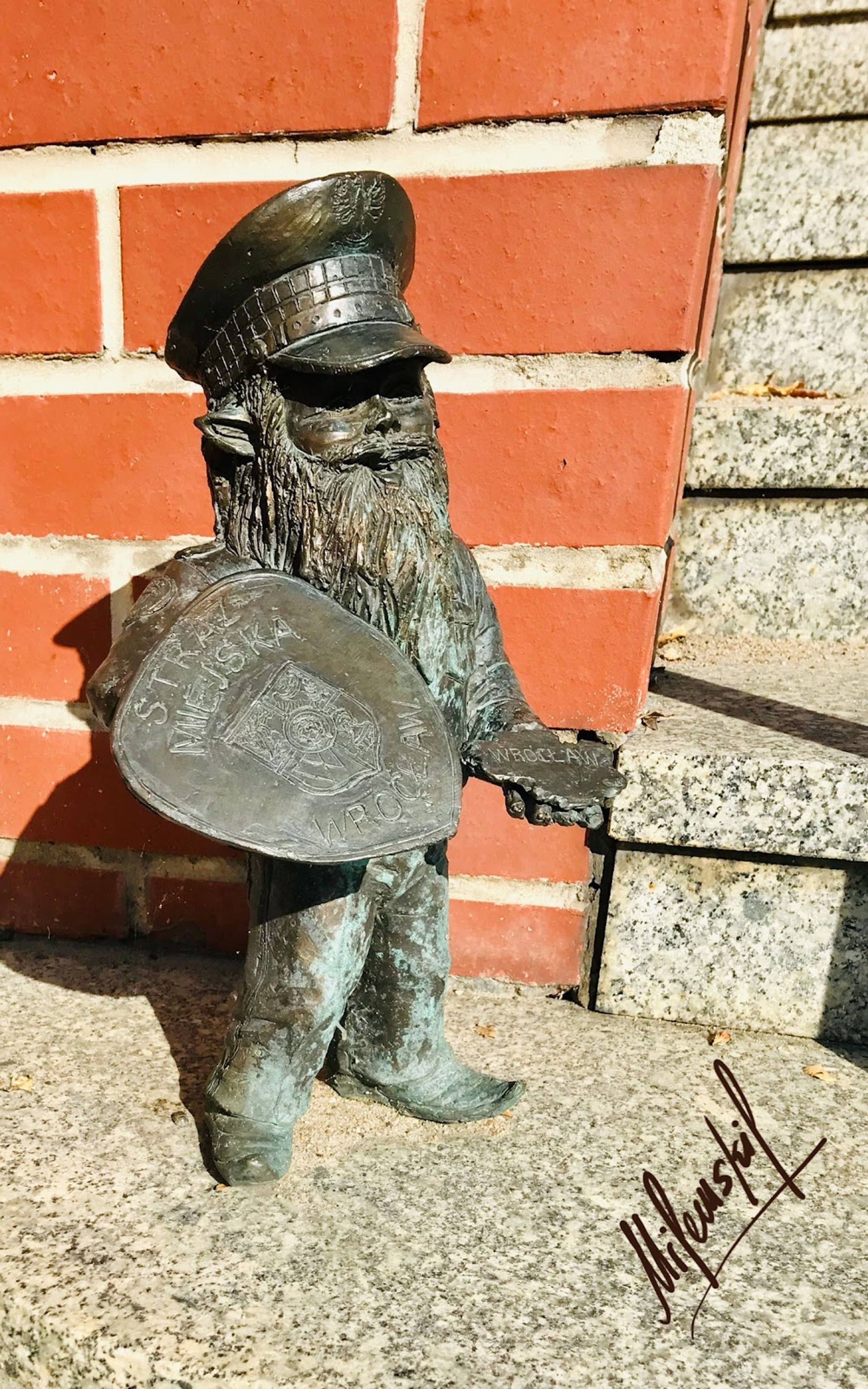 The figure represents one of numerous dwarf sculptures across Wrocław that form an artistic trail connecting different parts of the city.
