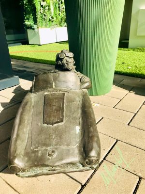 The bronze Beemicia dwarf statue stands near ground level, displaying intricate details and a polished surface that reflects sunlight throughout the day.