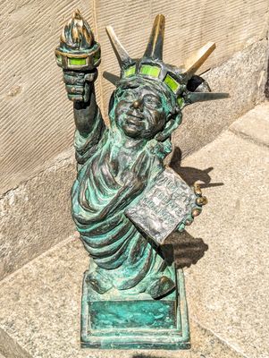 Lady Wolność stands as a small bronze statue that mirrors the appearance of the Statue of Liberty within the Wrocław dwarf collection.