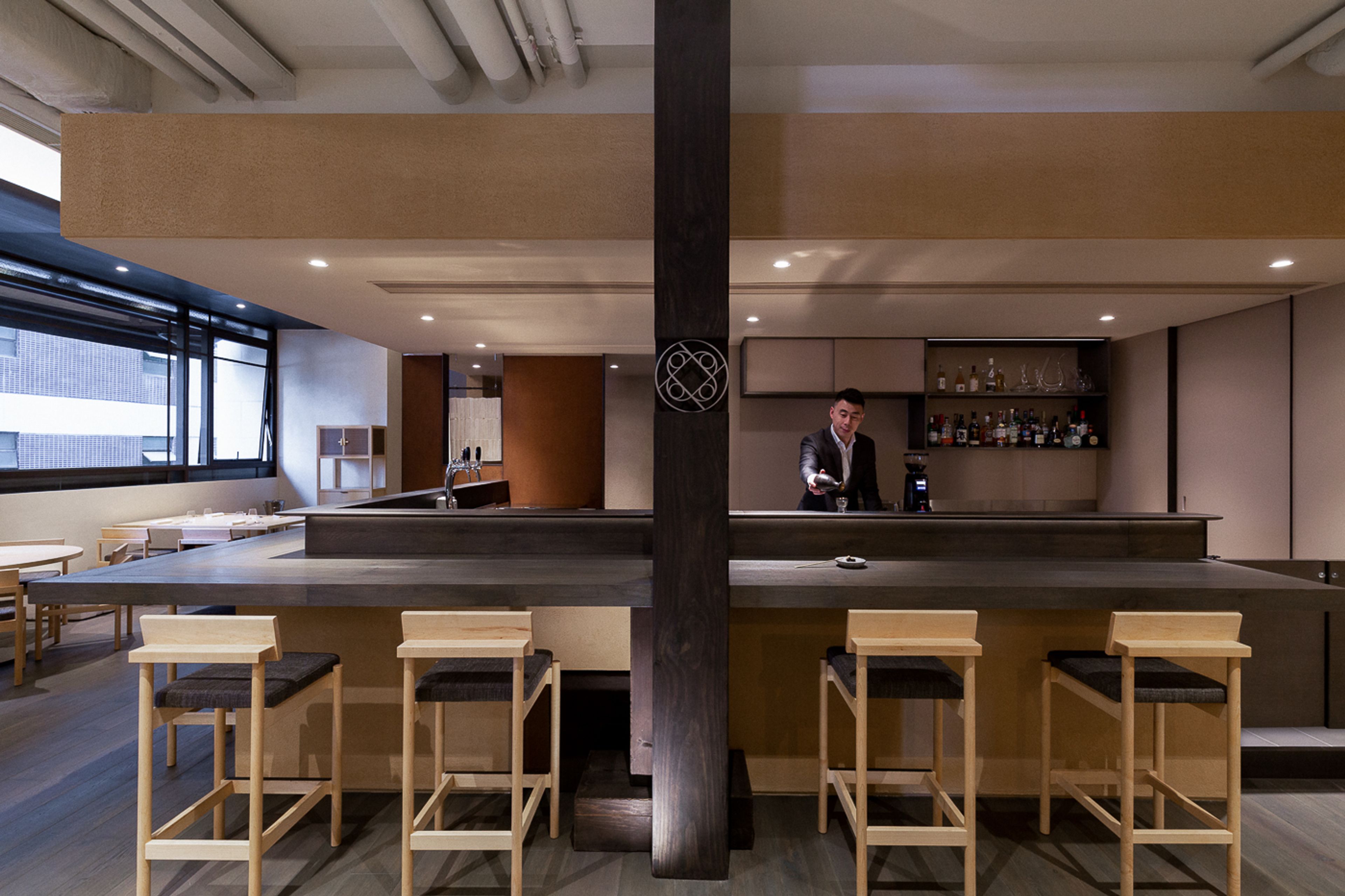 The dining area spans across the first floor of The Wellington building, featuring contemporary decor with natural wood elements and minimalist furnishings.