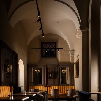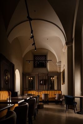 Caffè Doria occupies the former stable block of Palazzo Doria Pamphilj, with an internal fountain and reproductions of artistic works throughout the space.