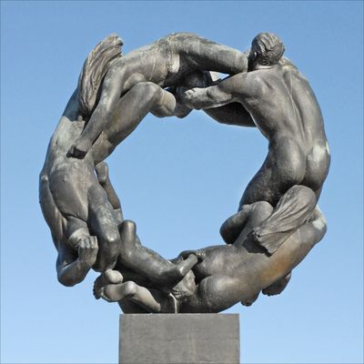 The bronze Wheel of Life depicts men, women, and children holding each other in a wreath formation at the west end of Vigeland Park.