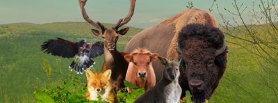 The park spans across a natural area with peat bogs, featuring large primitive herbivores including Aurochs, Highland Cattle, and Tarpan in their natural habitat.