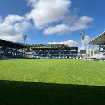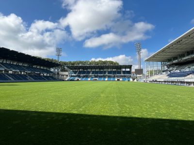 The stadium features multiple seating sections, modern sports facilities, and a regulation-size rugby field that meets international competition standards.