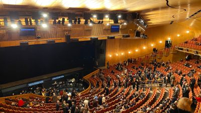 The Malmö Opera features a large auditorium with 1,511 seats and an orchestra pit that accommodates 60 musicians within its functionalist architecture.