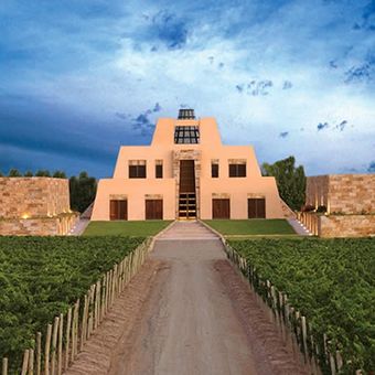 The winery structure incorporates architectural elements from Mayan pyramids, creating a connection between ancient American civilizations and modern wine production methods.