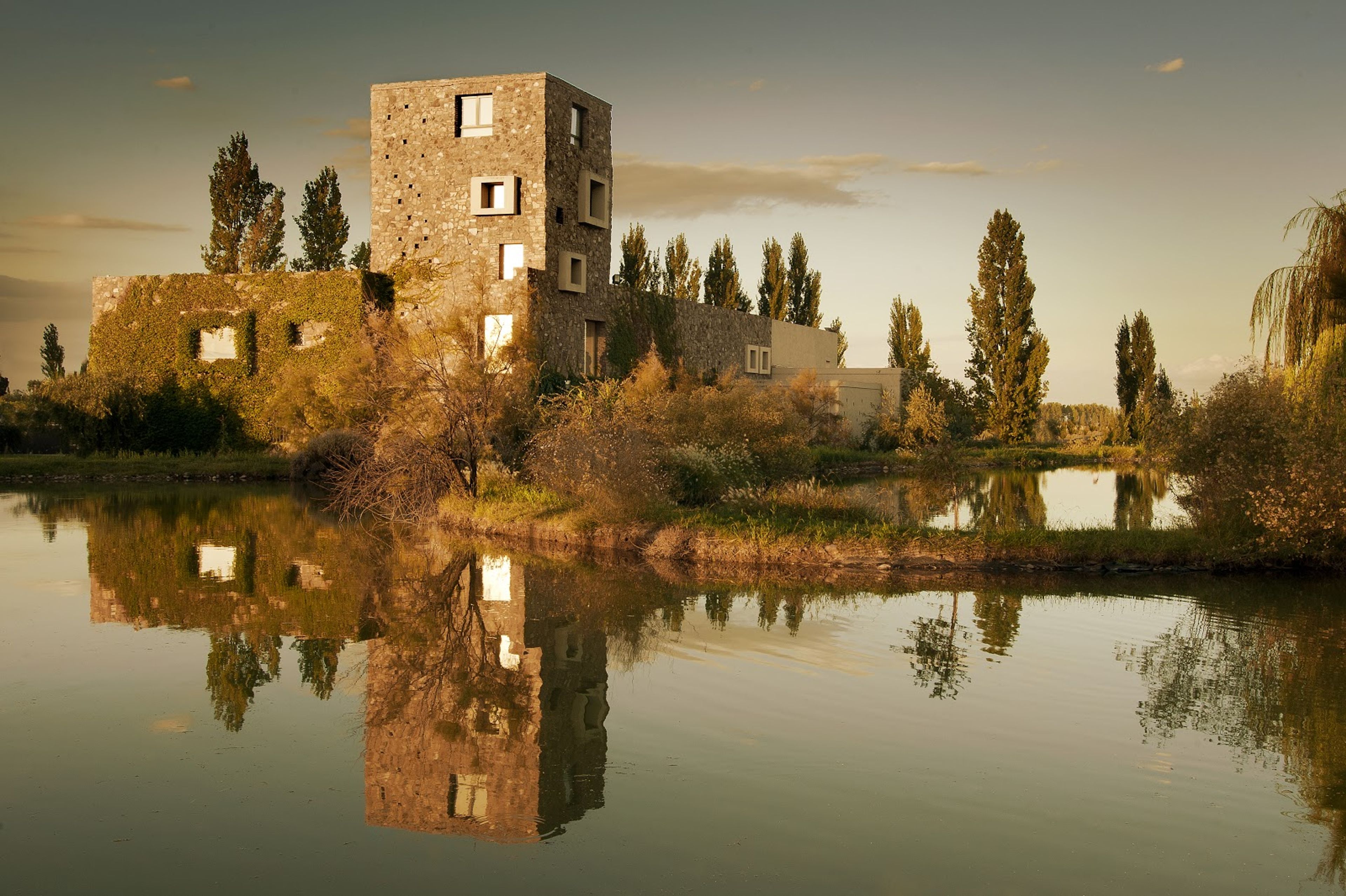 The winery extends across 30 hectares of land at the base of the Andes Mountains, with stone walls reflecting both traditional and modern architectural elements.