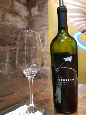 The wine room houses a collection of regional wines from Mendoza's vineyards, displaying bottles from different producers and vintages throughout the space.