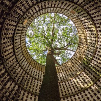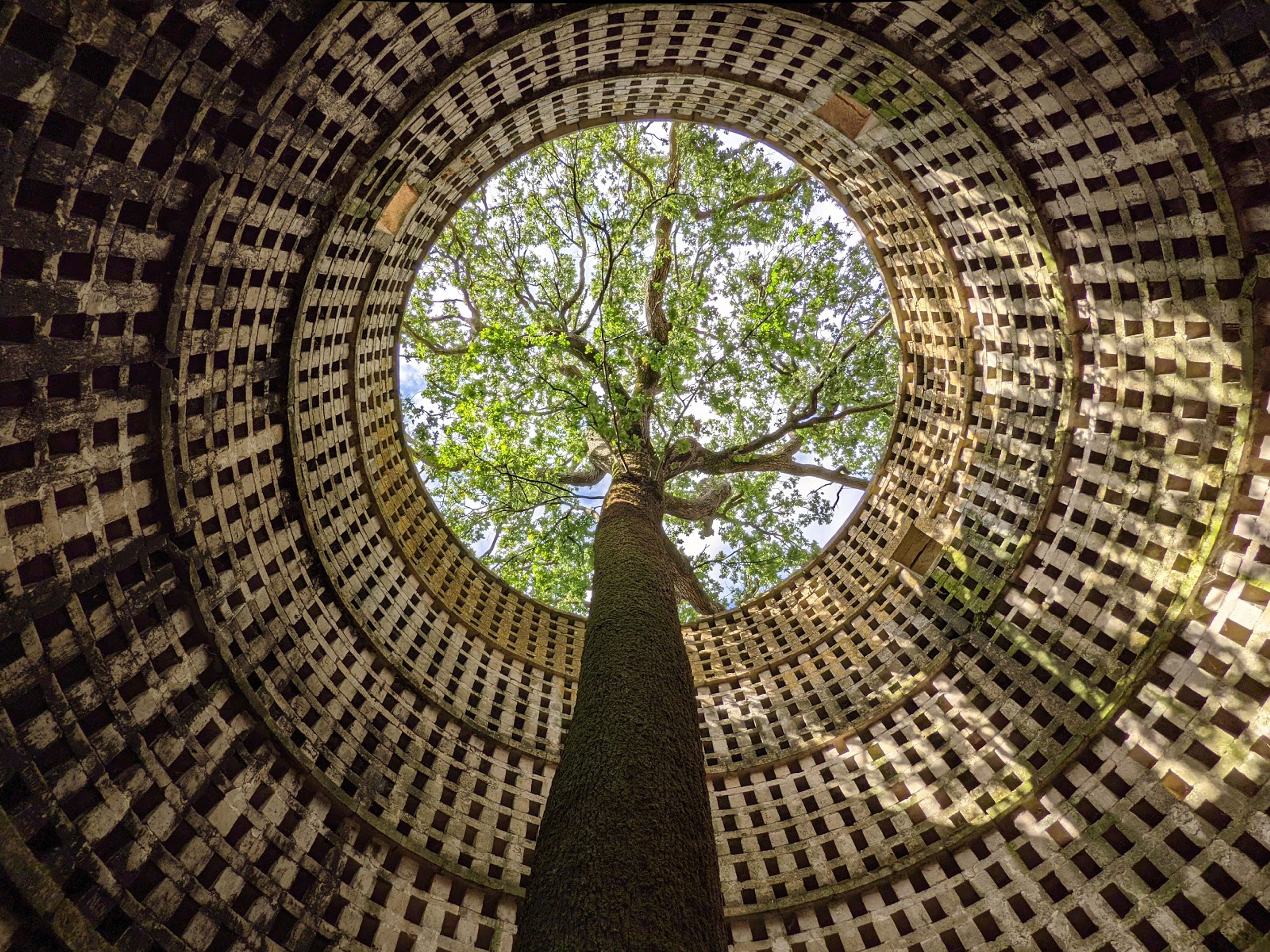 An oak tree now grows through the original roof structure, creating an unexpected natural integration with the architectural elements.