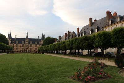 Place de la République features walkways, benches, and green spaces surrounded by historic buildings in the center of Nevers.